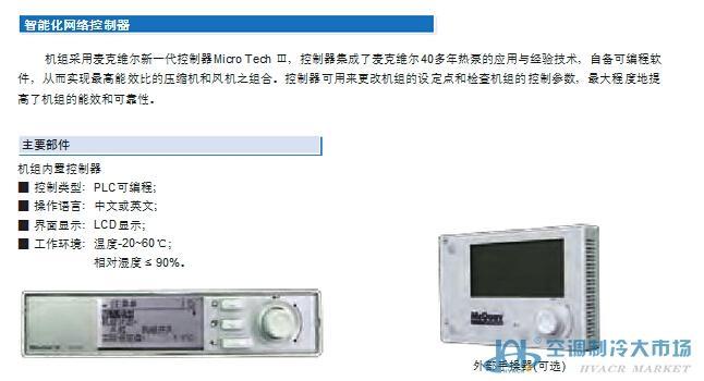 麥克維爾 “開拓者”系列(R134a)機(jī)組采用Micro Tech Ⅲ全中文智能控制器,具有多重保護(hù)功能,全自動(dòng)診斷故障并顯示報(bào)警。